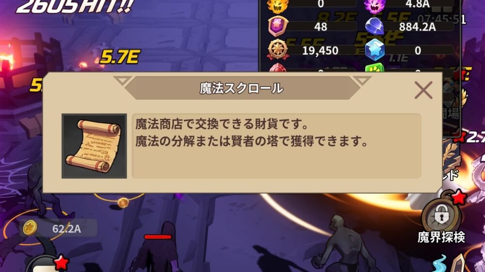 魔法分解を行うと、魔法スクロールが入手できる。魔法スクロールは、商店でエピック以上の魔法を個別に交換できるので、ある程度魔法スクロールが溜まったら、欲しい魔法を交換しよう。