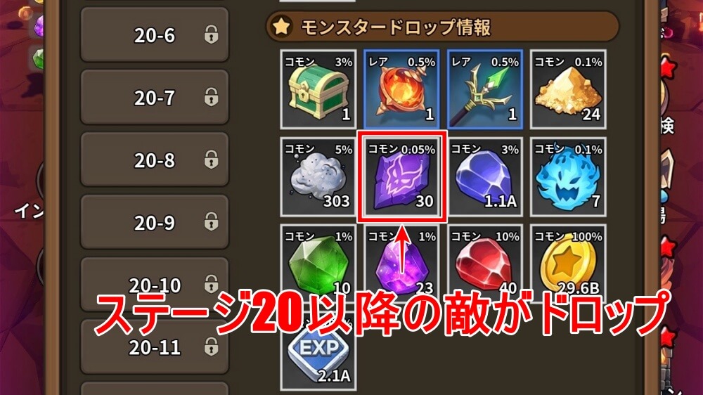 悪夢の欠片は、ステージ20以上のモンスターがドロップする。ステージ20にさえ到達できれば、自然と集まるので、ステージ20を目指して戦力を強化しよう。