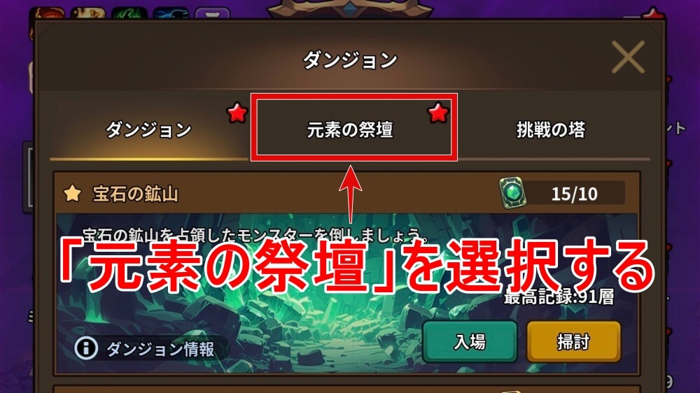 ダンジョンから「元素の祭壇」を選択する