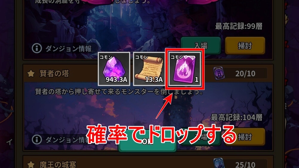 賢者の塔は、クリアすると確率で魔法スクロールや魔法ガチャチケットが入手できる。入手確率は、塔の層を進んでも変わらないが、入手した際のドロップ数は層を進めるたびに増えていく。