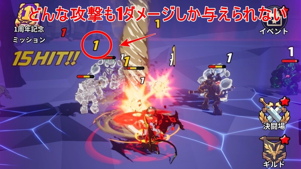 また、モンスターはどんな攻撃にも1ダメージしか受けず、3ダメージほど与えると倒れる。火力ではなく攻撃速度や手数が重要になるので、クリアできない場合は、潜在能力や魔王強化で攻撃速度を上げよう。