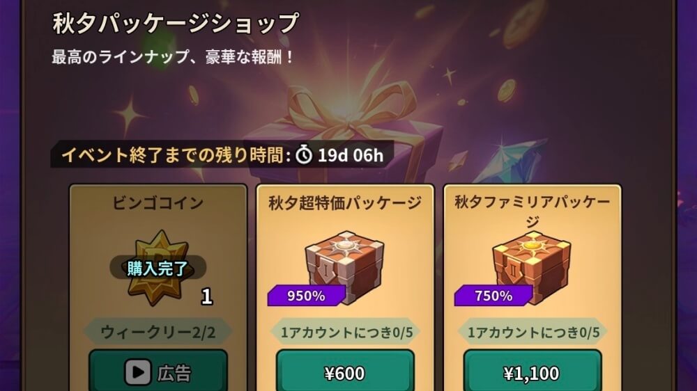 ビンゴコインは、パッケージ購入で入手可能だ。ビンゴコインの購入だけではなく、秋夕福袋を直接入手できるパッケージもあるので、時間短縮したい人はパッケージ購入すると良い。