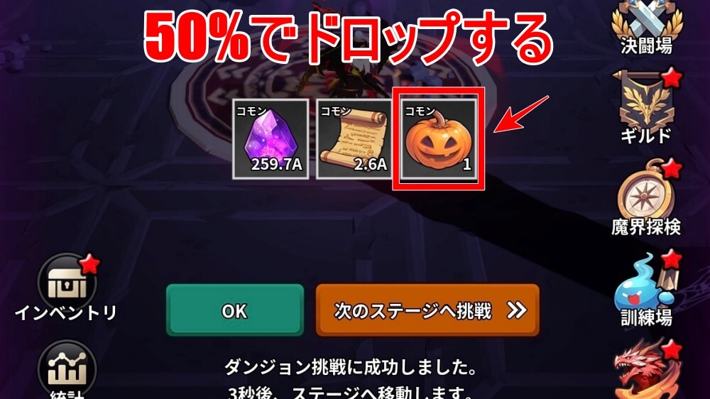 ハロウィンかぼちゃ集めのコツは、かぼちゃがドロップする「ダンジョン」「レイド」「決闘場」を周回すると良い。1回の挑戦で50%の確率でかぼちゃがドロップするので、期間中積極的に周回すると集めやすい。