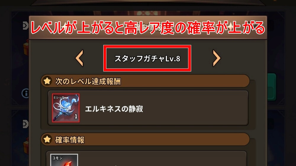 ガチャレベルを上げると、高レア度のスタッフの確率が上がり、高レア度のスタッフの排出が解禁される。確率以前に、ガチャを回さないと高レア度のスタッフが排出されないので、ガチャチケットや宝石に余裕があれば積極的に回していこう。