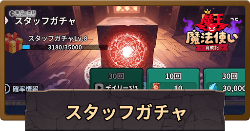 魔王魔法使い育成記の「スタッフガチャ」について解説。スタッフガチャの入手方法、ガチャレベルや排出率についても掲載中。魔王魔法使い育成記の育成の参考にどうぞ。