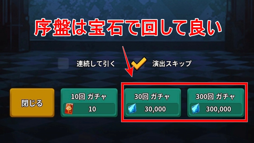 スタッフガチャを回す際は、序盤は宝石を消費して回しても良い。コンテンツが解放されていくと、大量に宝石が必要になるが、序盤はガチャ以外に使い道がほぼないので、回してガチャレベルを上げよう。