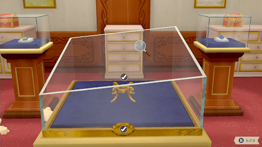 2階の右側にある宝石保管室に証拠があるので、階段を登って行こう。部屋の中央にある宝石ケースの前に立って、「現場検証をはじめる」を押すと調査が開始する。