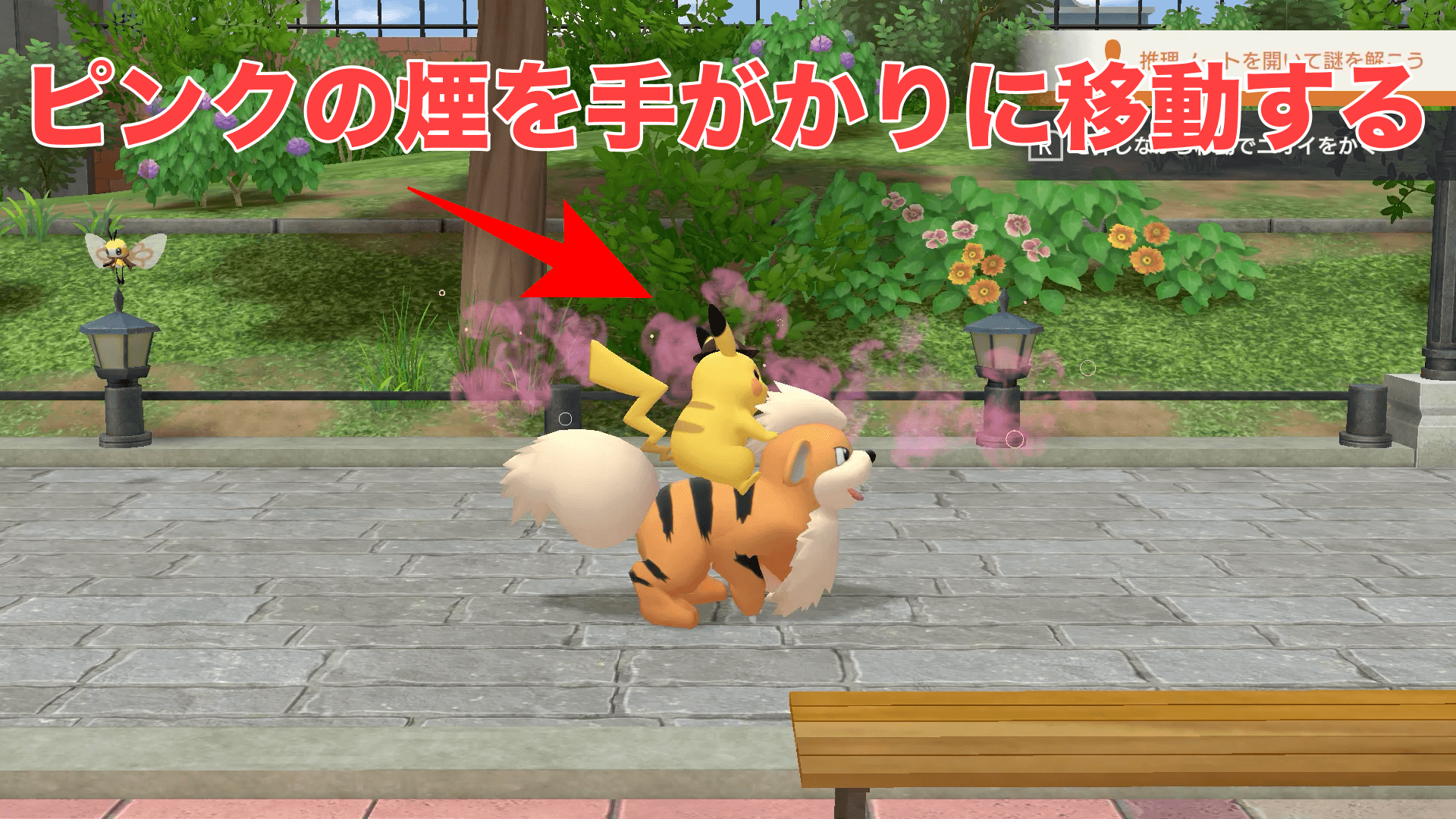 「ミツ集めにでかけたアブリーたちを捜そう」はピカチュウがガーディに乗っている状態でないと、受注できない。デニス邸に居るガーディに話しかけて、ガーディの力を借りてから憩いの公園に移動しよう。