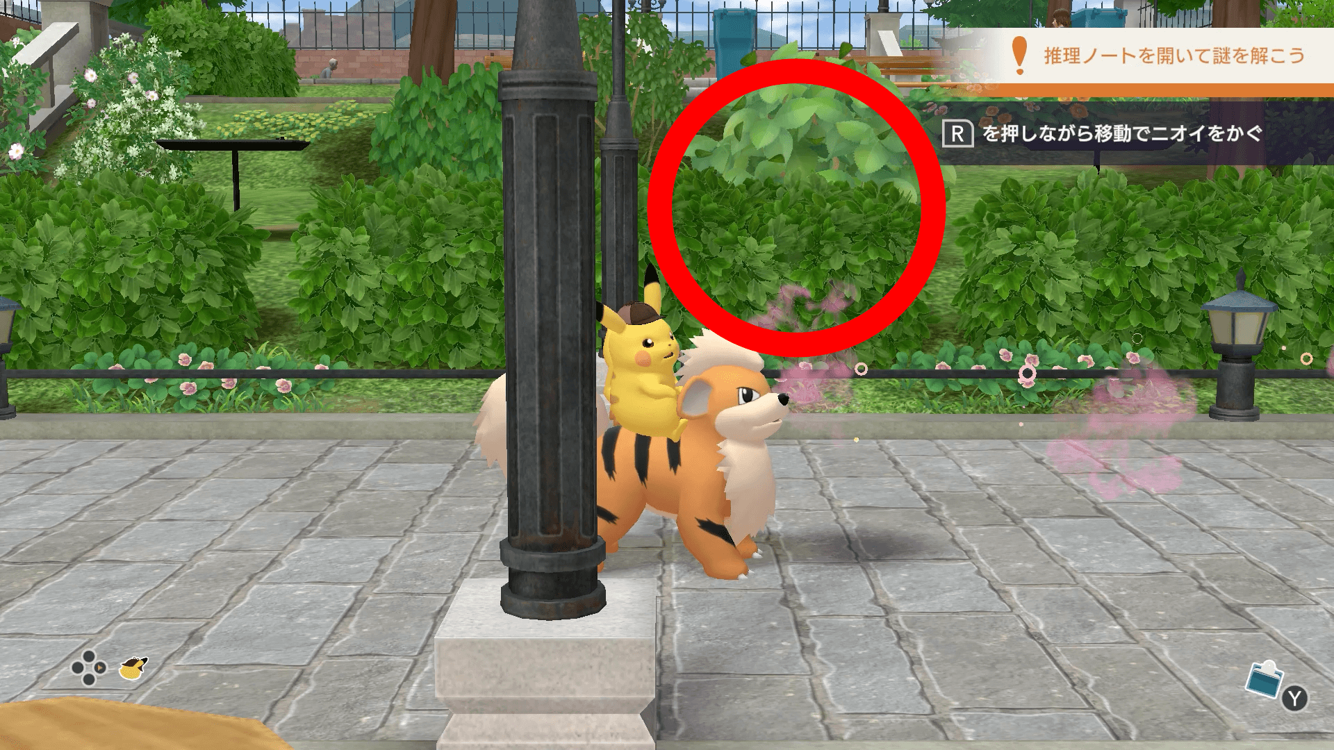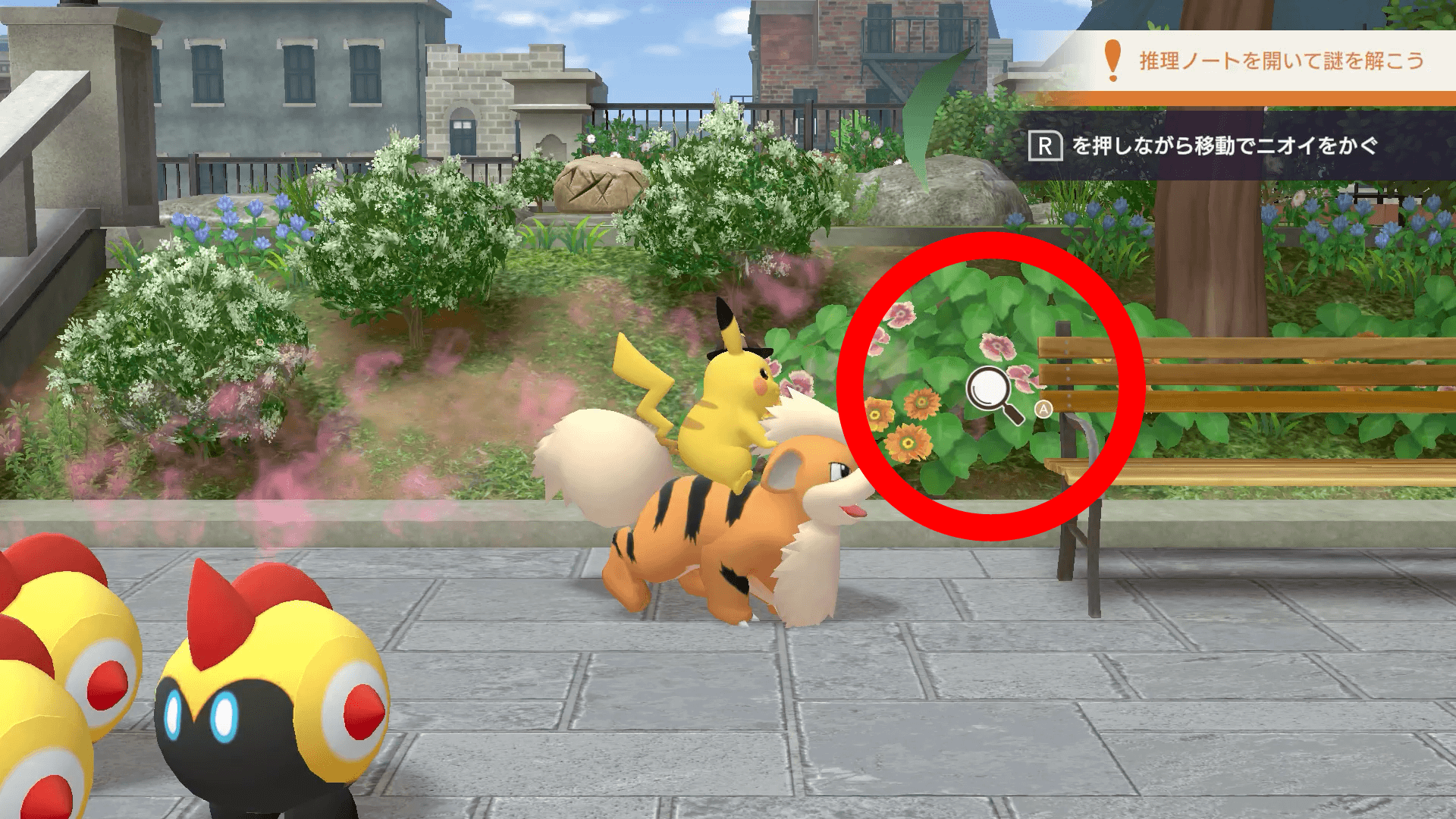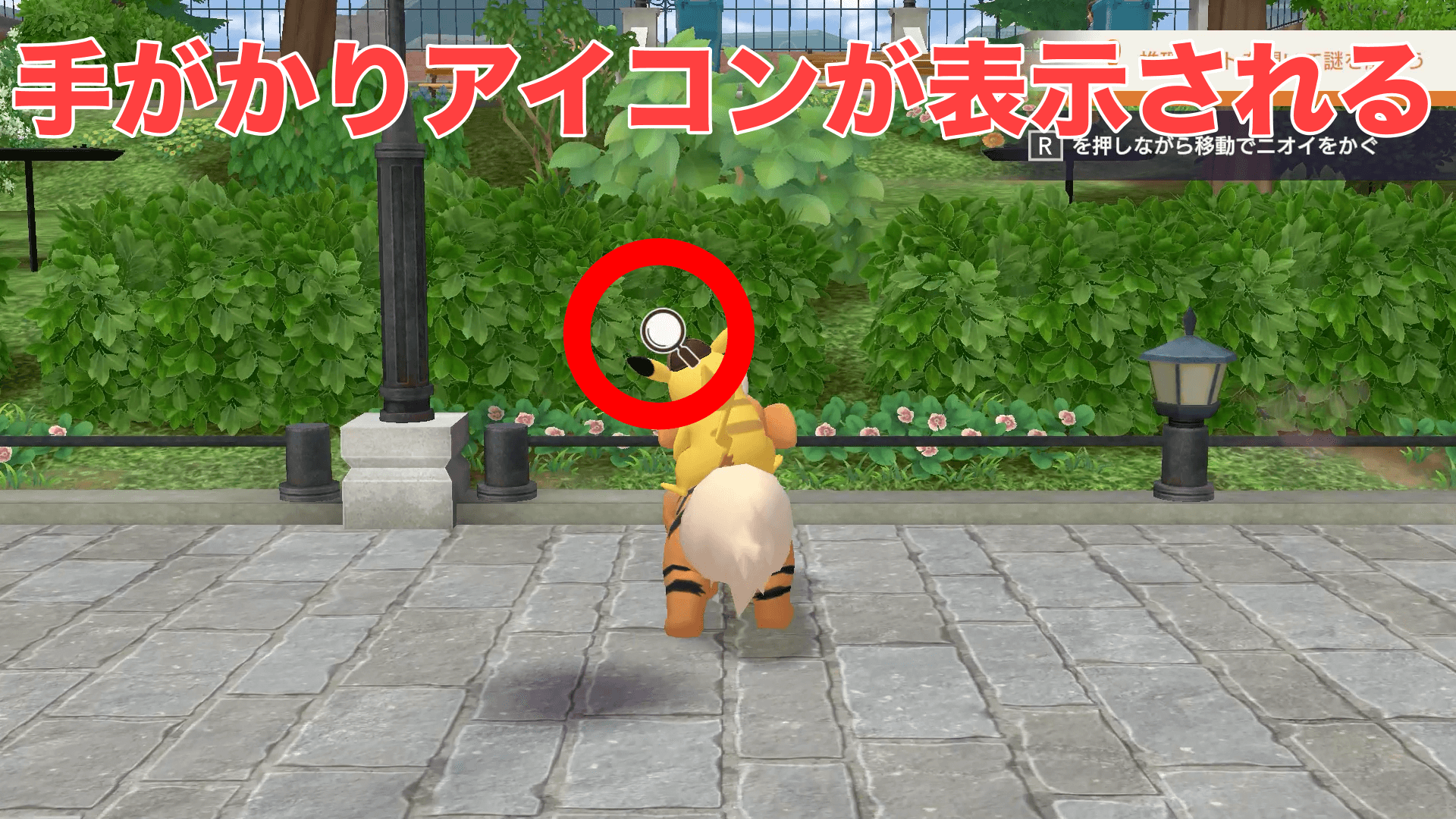 ニオイを手がかりにして、アブリーを2匹見つけよう。Rボタンを押しながら移動すると、ガーディがニオイをかいで、アブリーの場所までの道標が表示される。