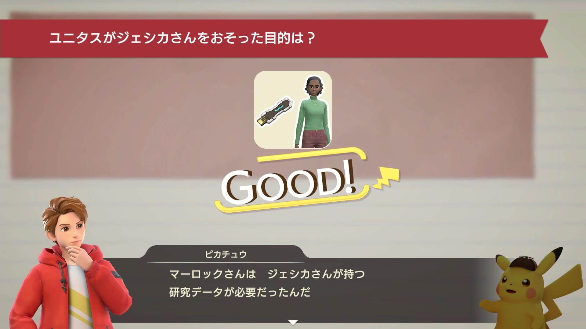 デスクを調べ終わったら、ポケモンを保護して集めていた理由を推理する。ユニタスは、「キューブの事件のため」にポケモンを集めており、様々な実験をしていた。