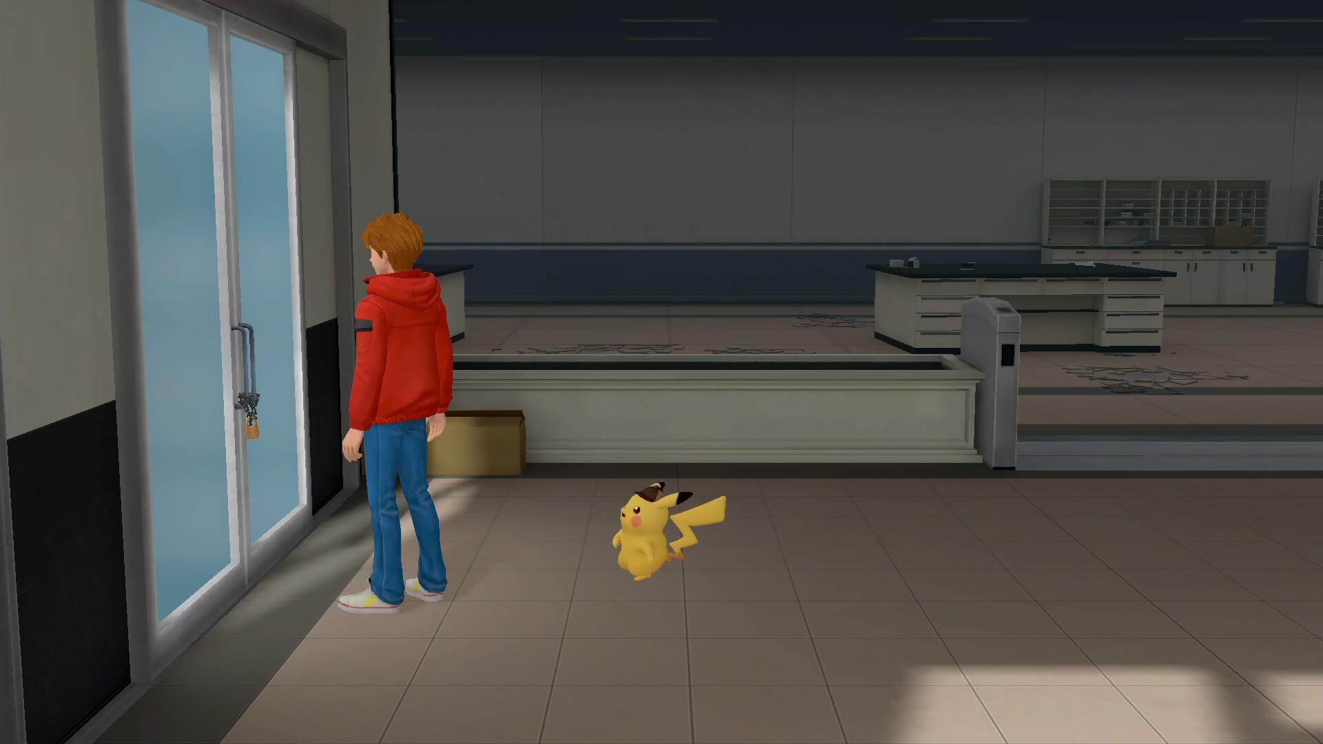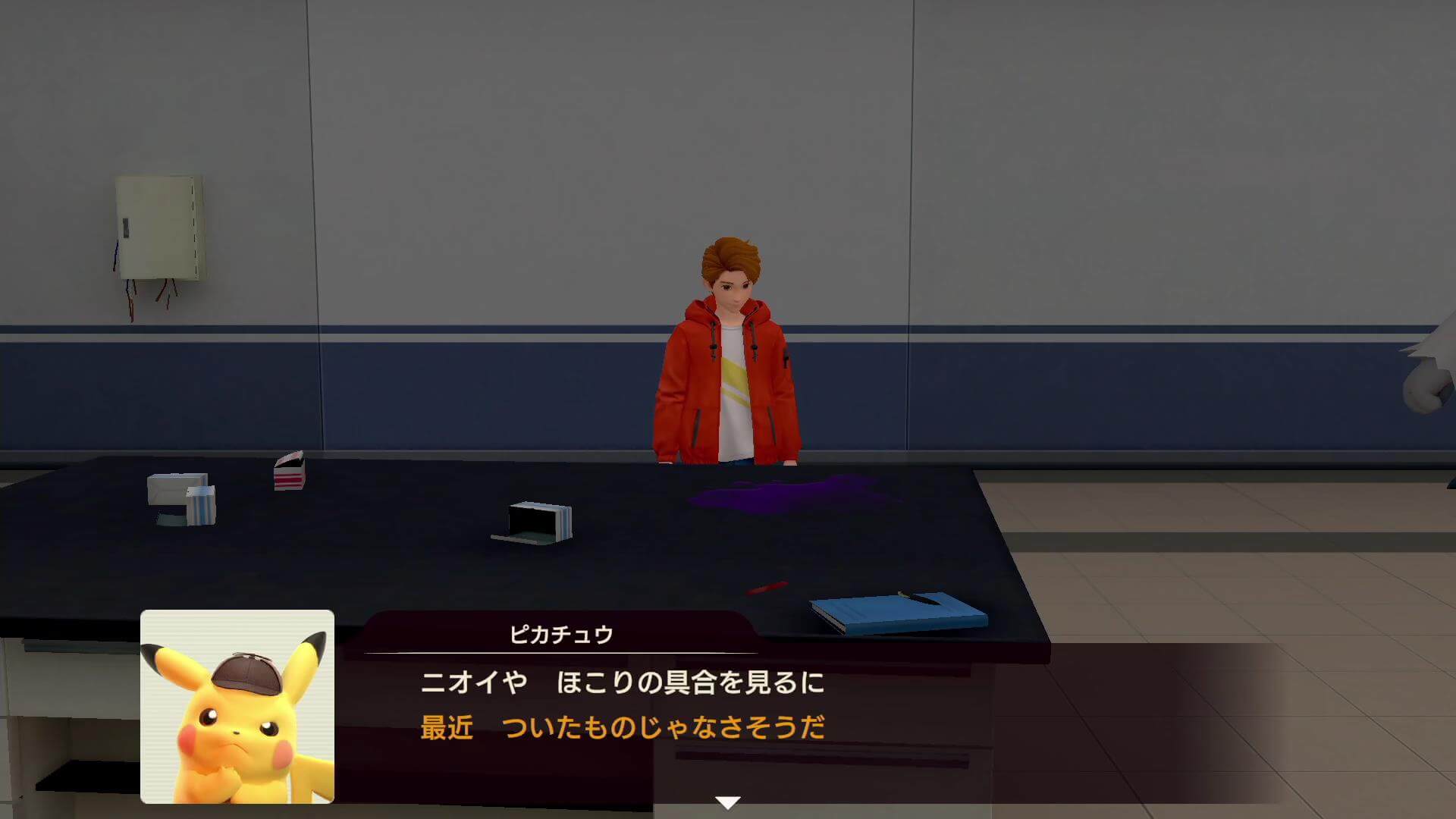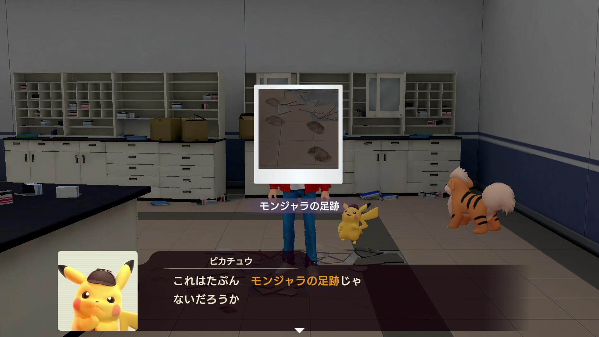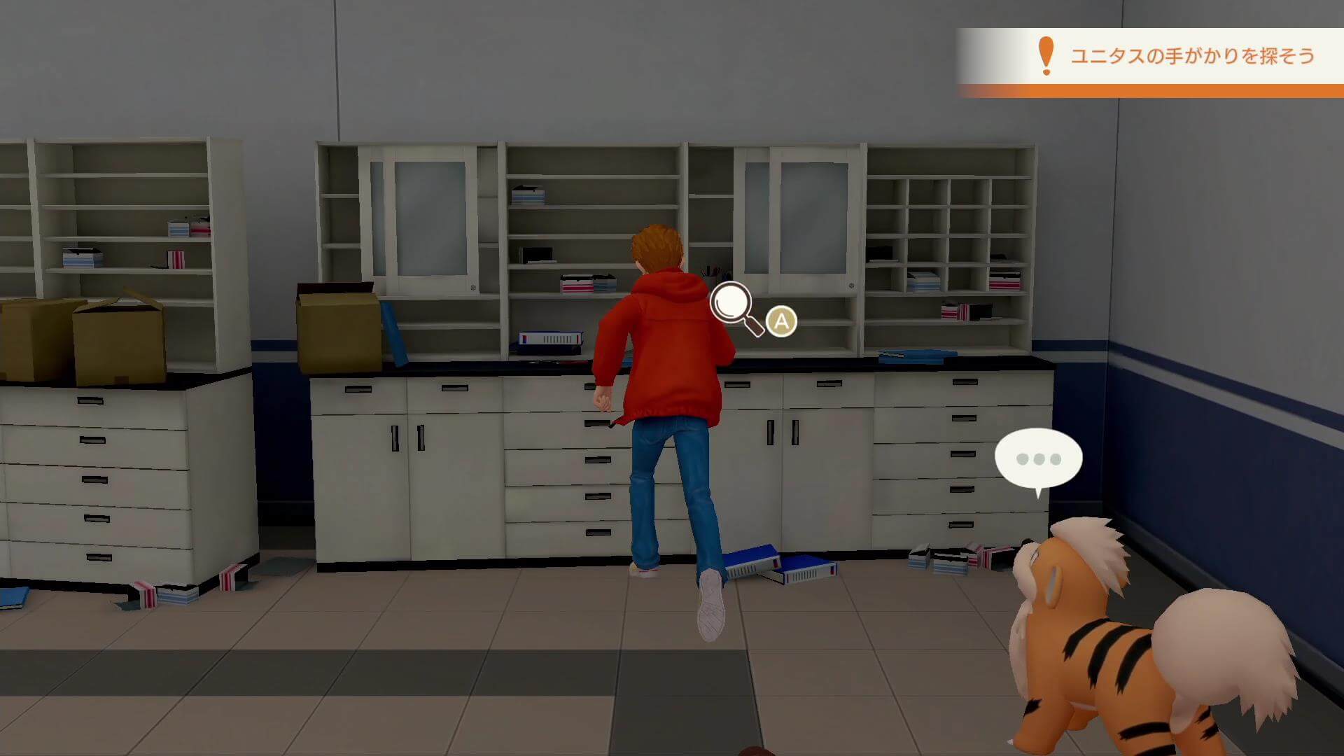 コントローラーでドリュウズを落ち着けたら、部屋を調べる。部屋のデスクを現場検証で調べると、ポケモンが閉じ込められていた部屋のドアを開けるため、中のポケモンにも話を聞こう。