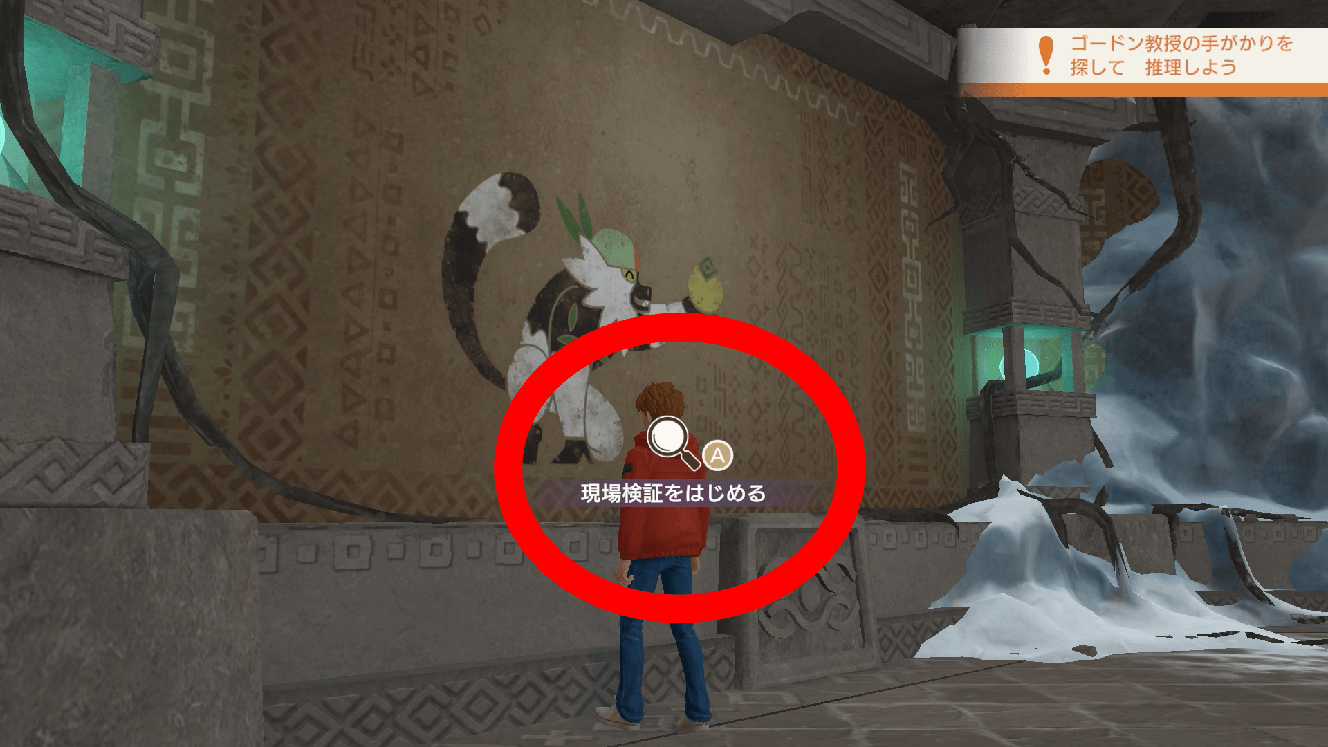 木や扉の前、机などの前に移動して現場検証できる場所を見つけよう。現場検証できる探す際は、フィールドの隅々を移動し、虫眼鏡アイコンが表示される場所を探すのがおすすめ。
