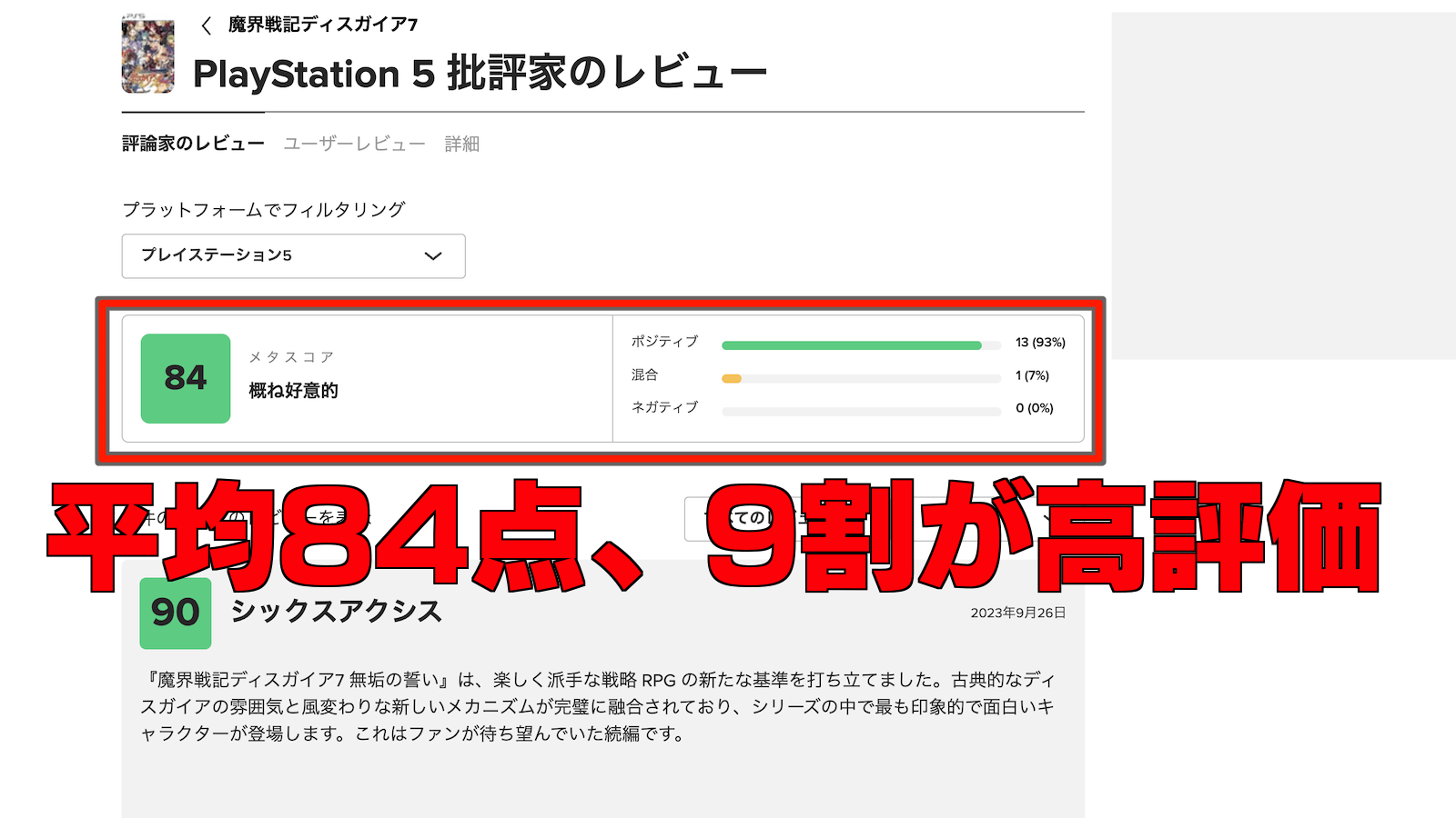 ディスガイア7は23年10月弐発売され、メタスコアは平均84点と高い数値を記録している。前作ディスガイア6が平均73、高評価5割だった状況と比べ、多くの要素が改善されたことが評価されている。