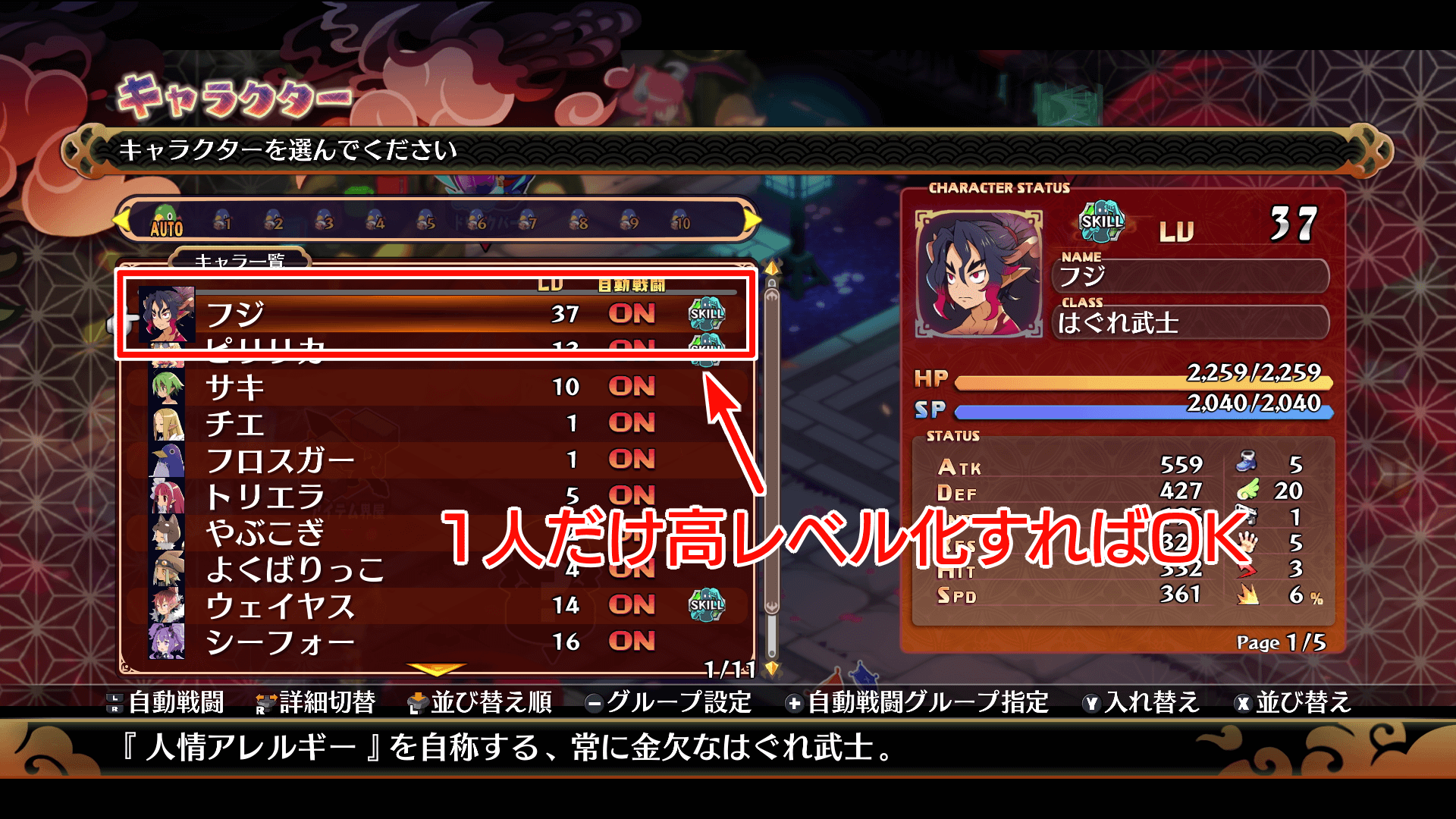 特化して育成したキャラ1〜2体で進んだ方が効率よく進むゲームだ。敵のレベルも勢いよく上がるため、1体を集中して育てた方が進めやすい。育成するキャラクターに悩んだら、主人公の「フジ」を育てておこう。