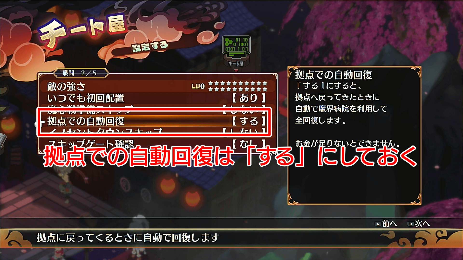 チート屋を解禁すると細かい設定も可能になり、拠点に戻ったときに自動回復するよう設定できる。自動回復時にお金を消費するものの、回復でお金を消費すると、ガ邪ポン用のRPが貯まるためむしろお得だ。