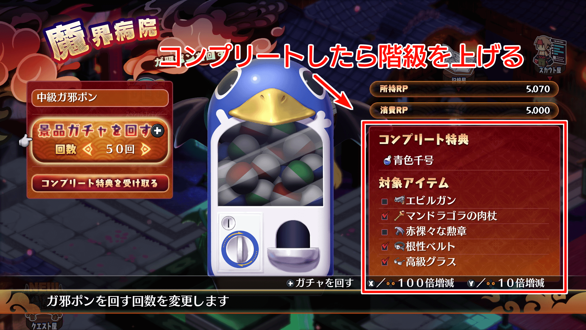 ステージ1-5までクリアできたら再び暗酷技館へ行き、「ガ邪ポンを回したい!」を可決してガ邪ポンを解放しよう。ガ邪ポンから手に入る装備は販売品よりも高性能で、高ランクのガチャを回すほど強力になる。積極的にRPを溜めて、コンプリート報酬を狙おう。
