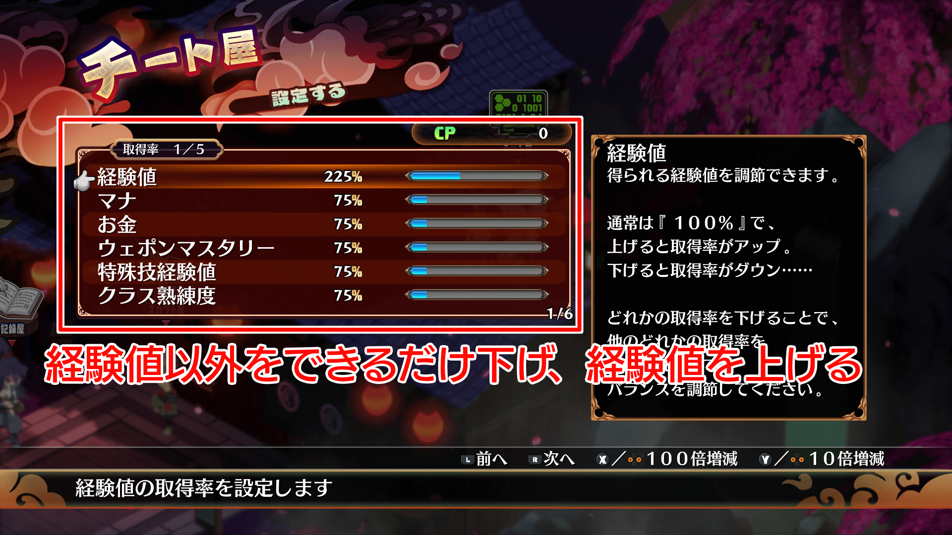 敵を倒してマナが溜まってきたら、「暗酷技館」に行き、「ズルして楽したい!」を可決してチート屋を解禁しよう。チート屋では獲得物の倍率を変更でき、経験値の獲得倍率を引き上げられる。序盤はレベルが重要になるため他の項目を最低にして、経験値の倍率を上げよう。