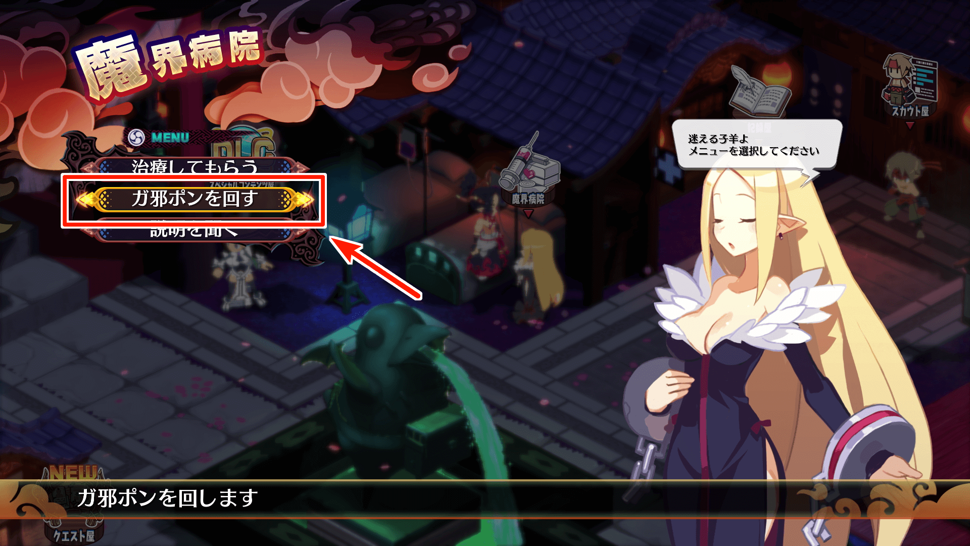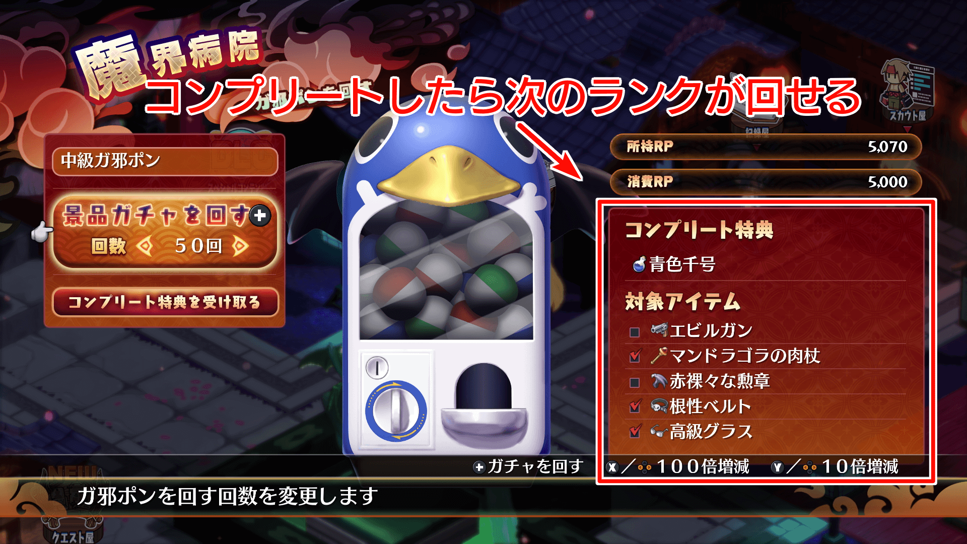 ガ邪ポンは拠点の魔界病院に追加される。専用のポイント「RP」を消費して、アイテムや経験値をランダムに入手できる。中には強力な装備も含まれているため、解禁されたら積極的に回すのがおすすめだ。