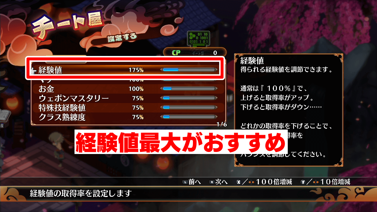 レベル上げを行う場合は、事前にチート屋を解放し設定を変えておこう。チート屋の設定は、下の項目を最小まで下げて経験値を最大にするのがおすすめ。なお、チート屋は「暗酷技館」の議会で可決されると解放される。
