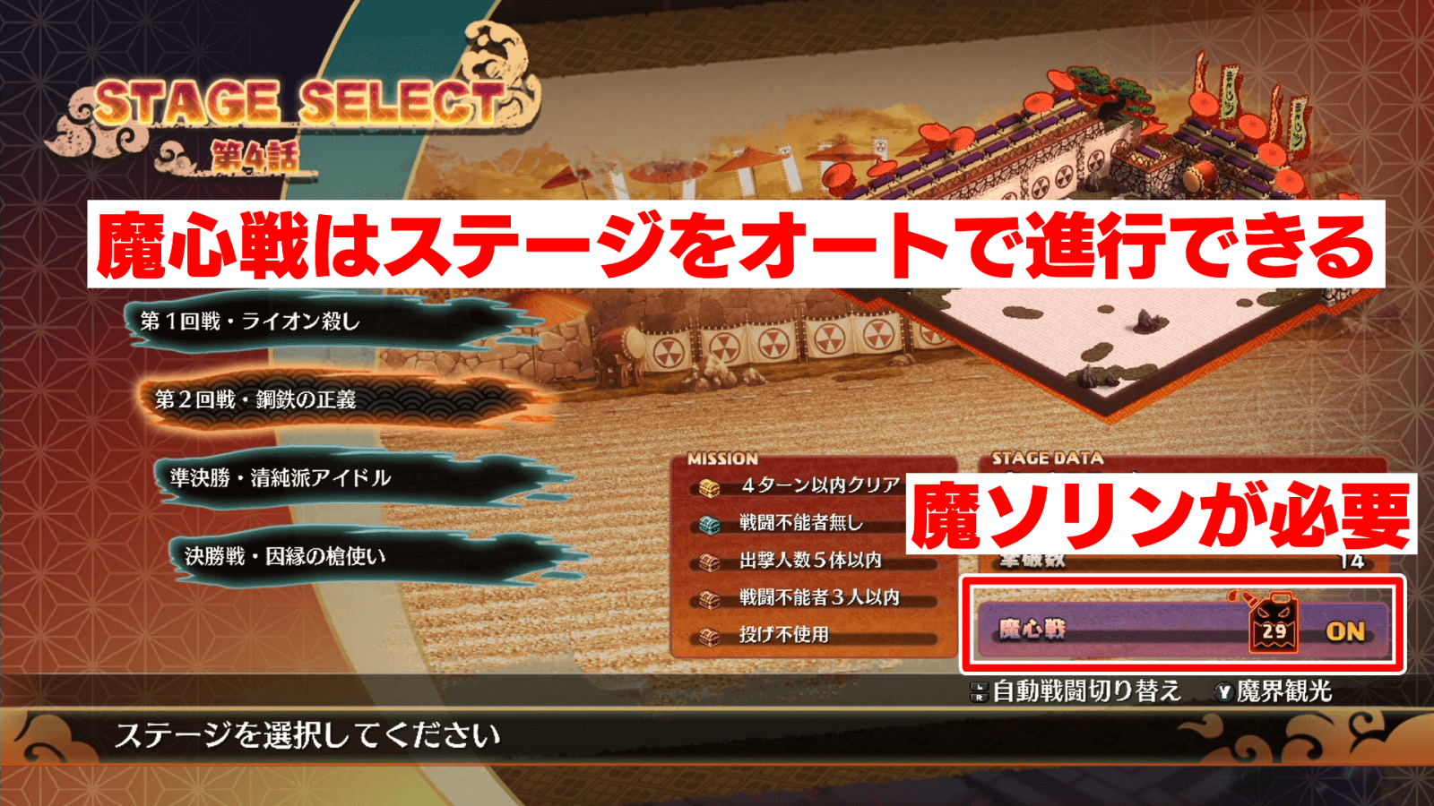 4-5クリアで解放される魔心戦を使うと、クリア済みのステージをオートで進行できる。ステージ画面でLRボタンを押すと、魔心戦ON・OFFの切り替えが可能だ。なお、魔心戦を行うには、手動でステージをクリアすると貯まる「魔ソリン」が必要になる。