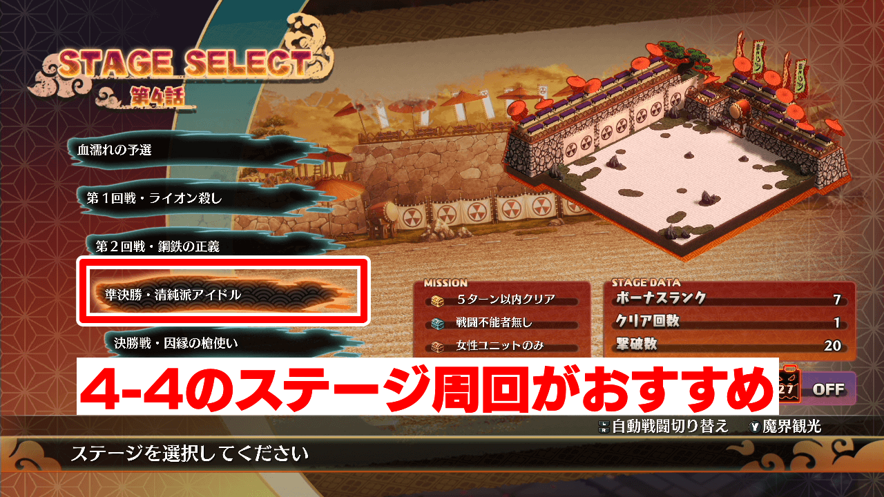 4話でレベル上げをする場合は、4-4のステージ周回が最もおすすめだ。レベルの低い味方を戦闘不能にさせてから、レベルを上げたいキャラで弩デカ魔ックスを発動して敵を倒せば良い。