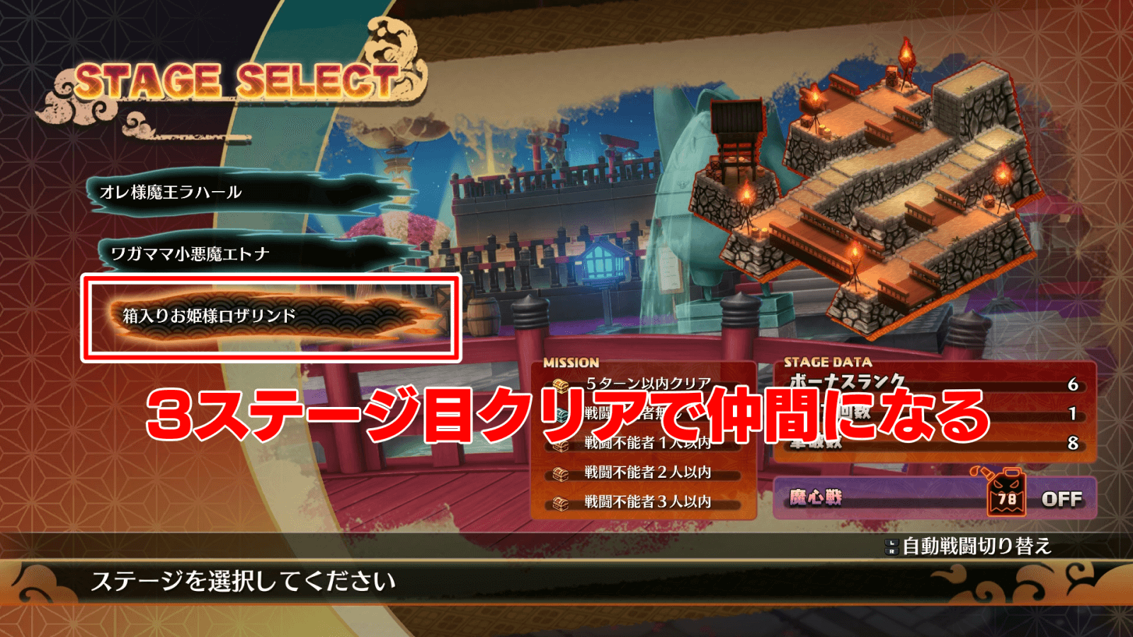 ロザリンドは、DLC「魔王と魔人と箱入り娘編」をクリアすると仲間になる。DLC「魔王と魔人と箱入り娘編」は、2ステージ目で出現するエトナとプリニーの魅了が厄介であるため、状態異常回復用アイテムや魔法を用意しておくと良い。