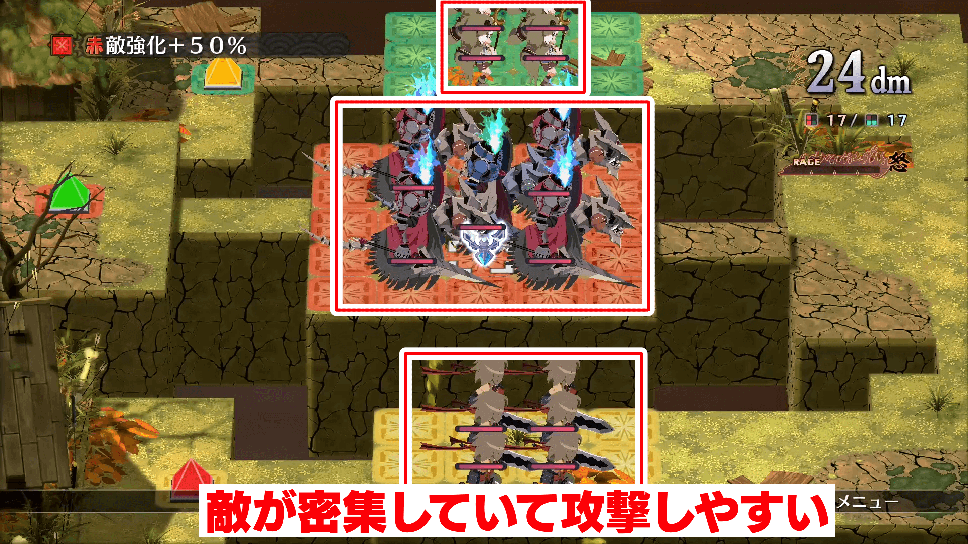 8-3はキャラを投げて奥まで進め、中央の敵陣奥にある敵強化のジオシンボルを優先して怖そう。緑と黄色の効果は味方も恩恵を受けられるが、赤パネルは敵にしかメリットが無い。敵の配置は密集しているので、敵強化を解除したら範囲攻撃や弩デカ魔ックスでまとめて倒そう。