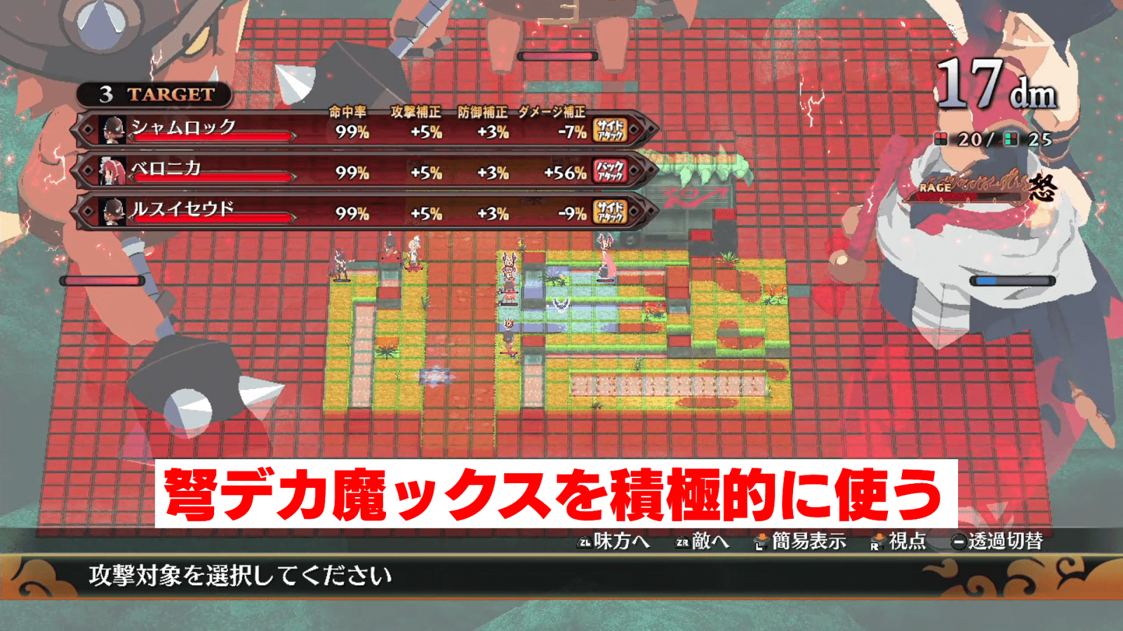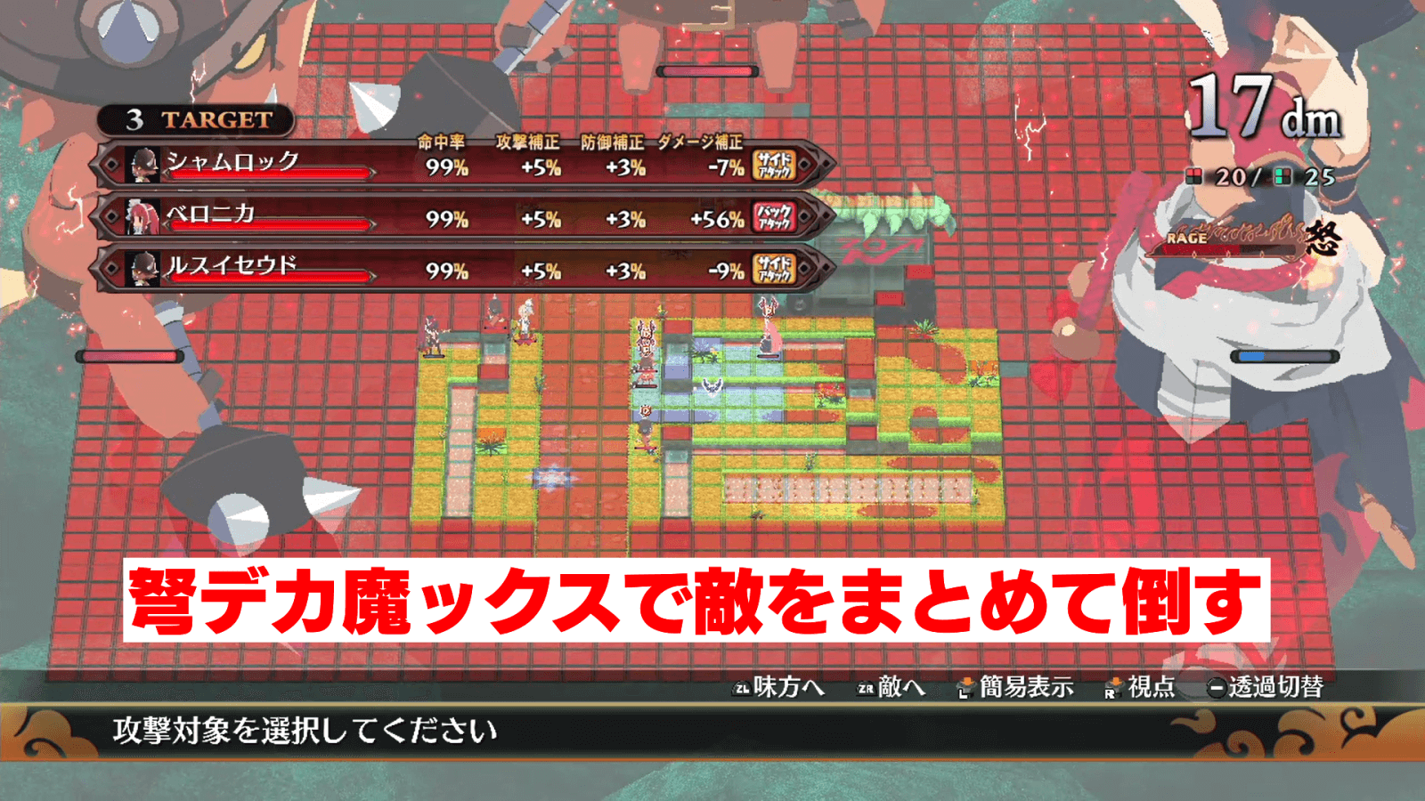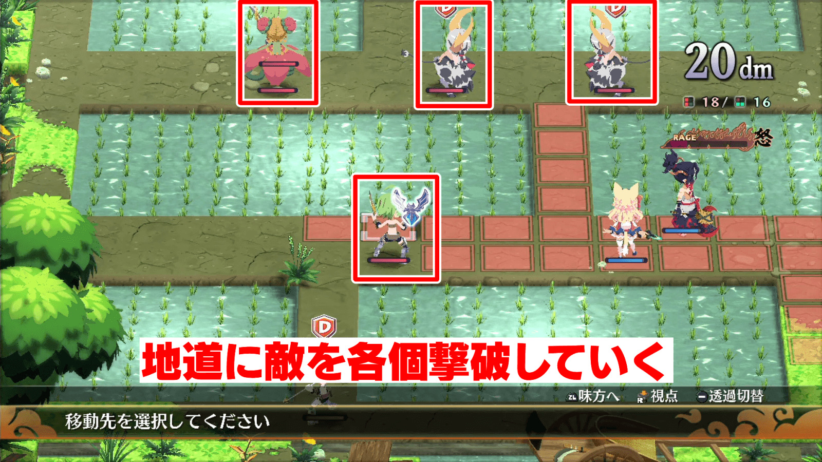 6-1ではマップの四方に敵が散らばっているため、地道に敵を各個撃破していこう。激怒ゲージが溜まったら弩デカ魔ックスを使って、数の多い敵グループから順番に倒すと良い。田んぼの間のあぜ道にいる敵は、遠距離攻撃の武器や魔法を使って攻撃するのがおすすめだ。