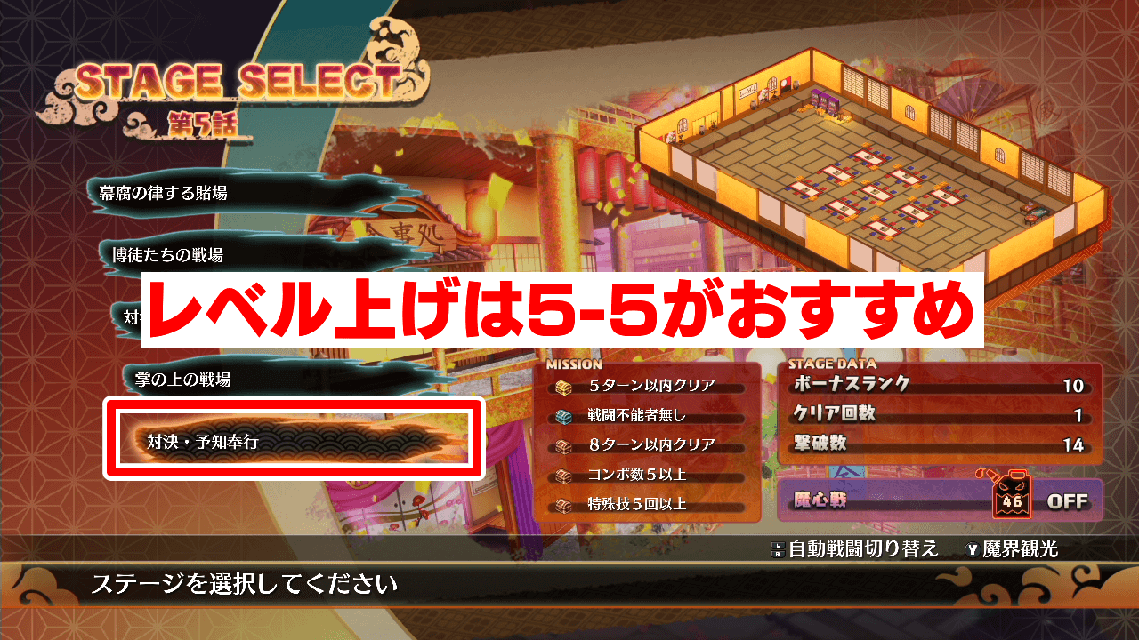 6話はステージが広く複雑でレベル上げしにくいため、レベル上げを行う場合は、5-5「対決・予知奉行」などを周回しよう。5-5は敵が密集しているので、弩デカ魔ックスを使って複数の敵をまとめて倒せば効率的に周回可能だ。
