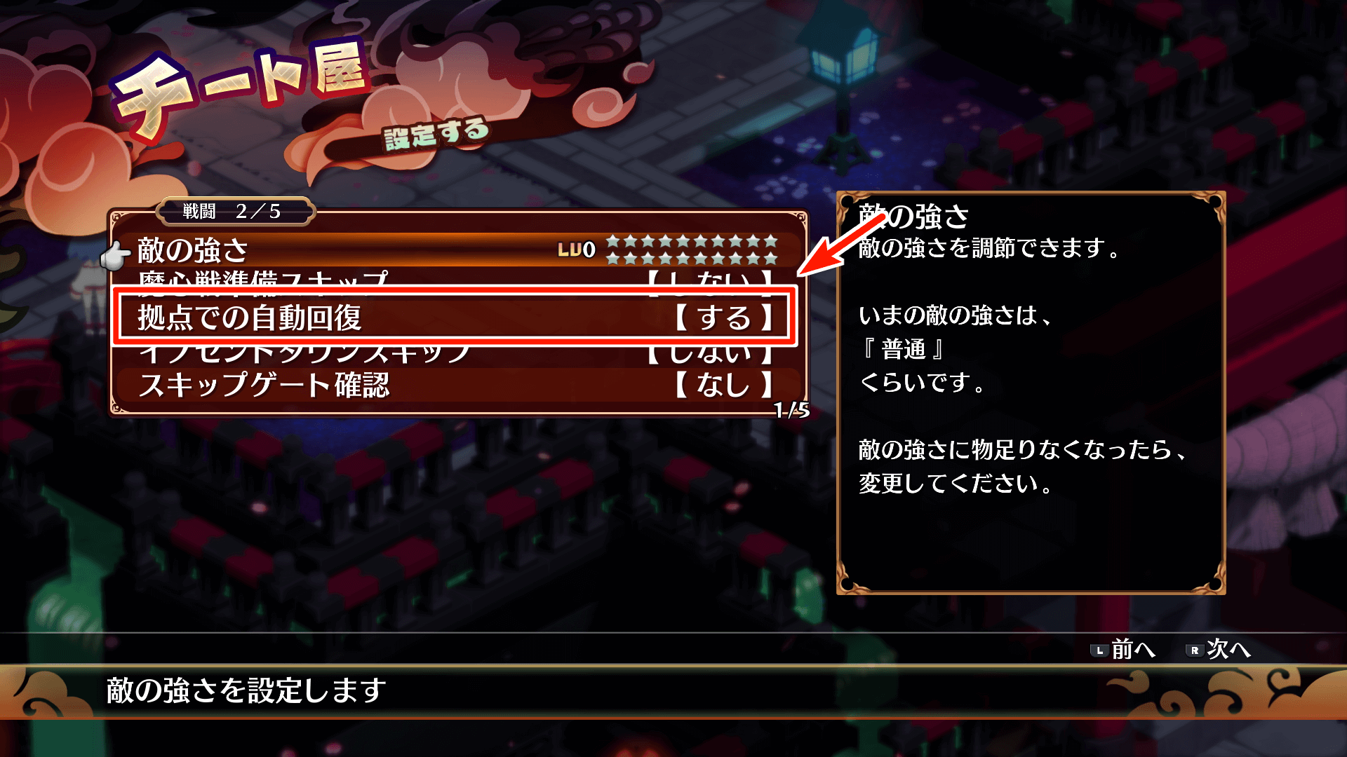 どんなプレイでも、拠点での自動回復はオンにしておくのがおすすめだ。毎回魔界病院で回復する必要がなくなり、ストレスフリーにプレイが進められる。回復時に自動的にお金が減少し、金額不足の場合は回復が行われないため、アイテム界などに潜る時だけ回復されているか確認はしておこう。