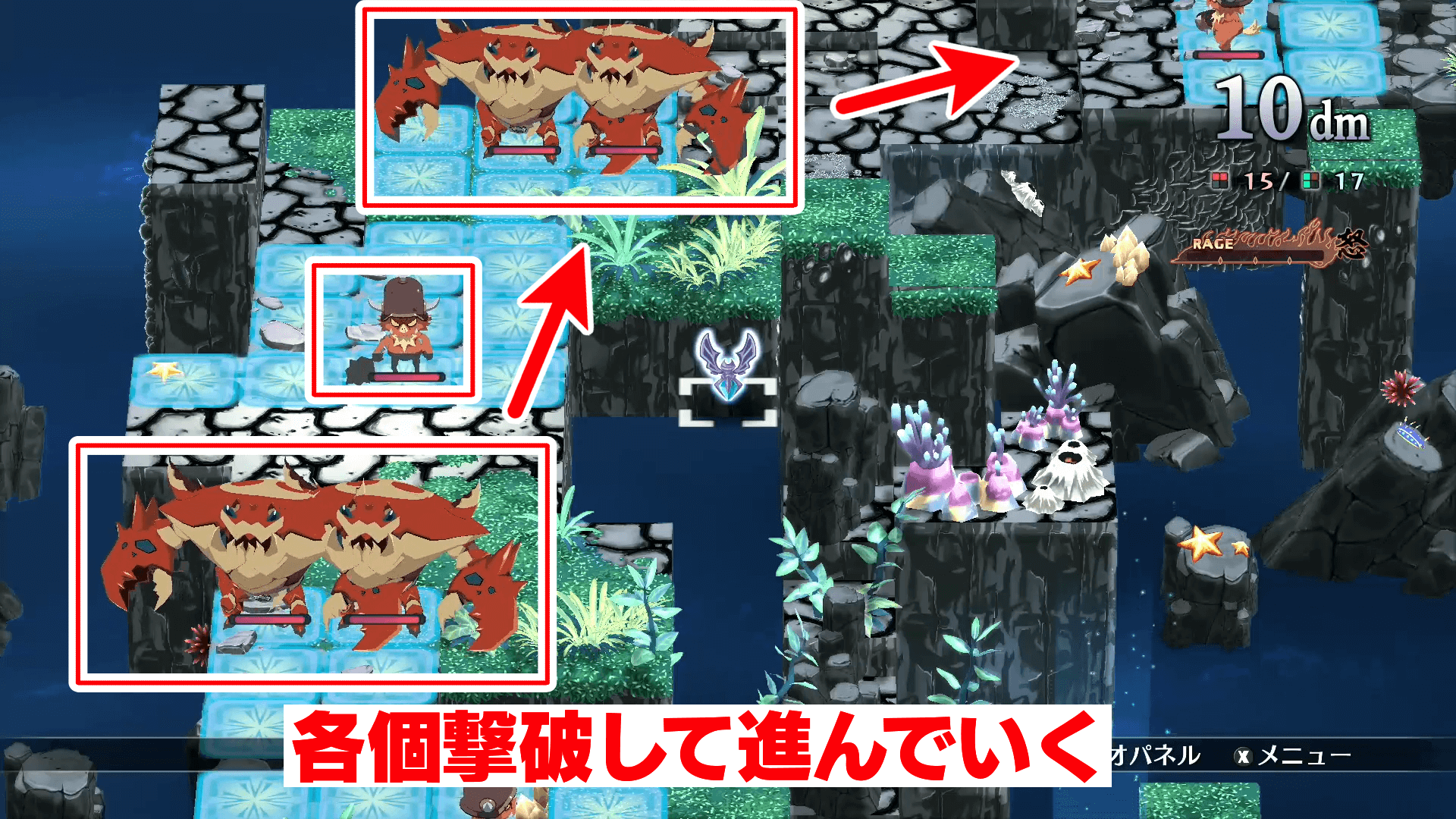 9-1は敵がまばらに配置されているので、手前の敵から各個撃破していこう。道が狭いので、敵を倒しつつ進んでいくと良い。激弩メーターが溜まったら、奥に配置されている敵は弩デカ魔ックスで倒すと移動の手間が省ける。