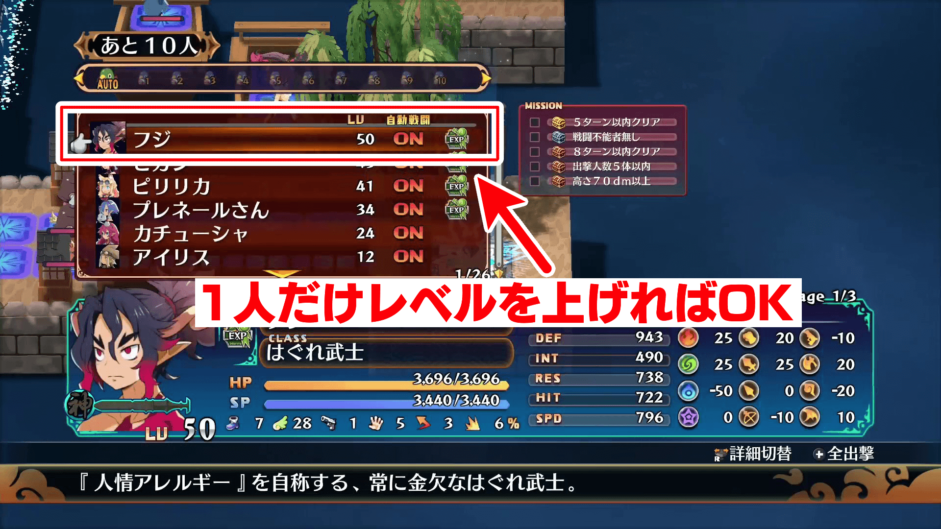 ディスガイア7は、少数のキャラに特化して育成した方が効率よく進められるため、メインキャラに経験値を集中させてレベルを60以上に上げよう。キャラにこだわりがない場合は、戦闘力や移動力が高いフジのレベルを上げると良い。