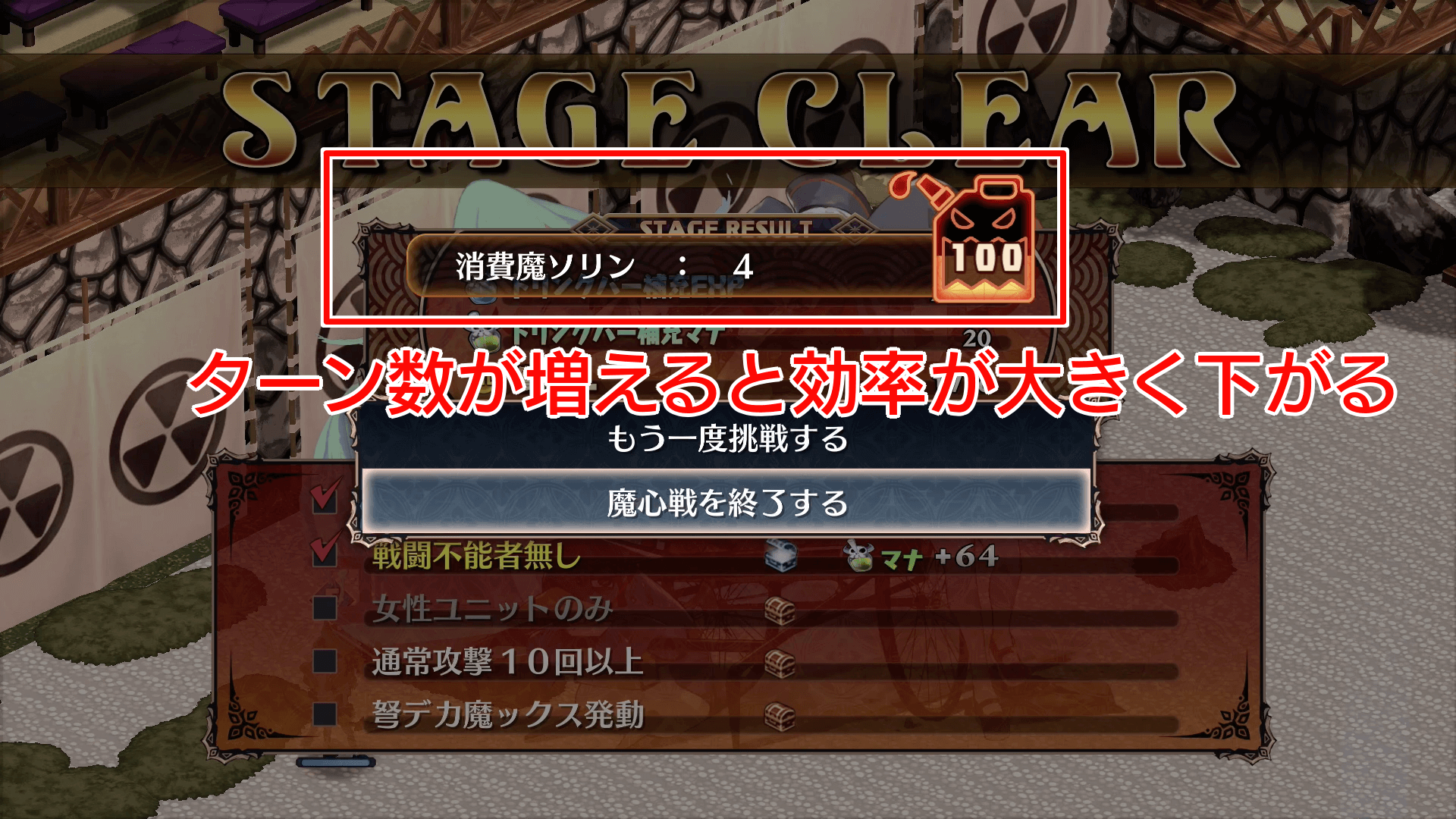 魔ソリンはオートバトルに相当する「魔心戦」で消費する。1周あたりの消費ターンが少ないほど、消費する魔ソリンも減少するため、1ターンでクリアできる構成でオート周回を目指そう。