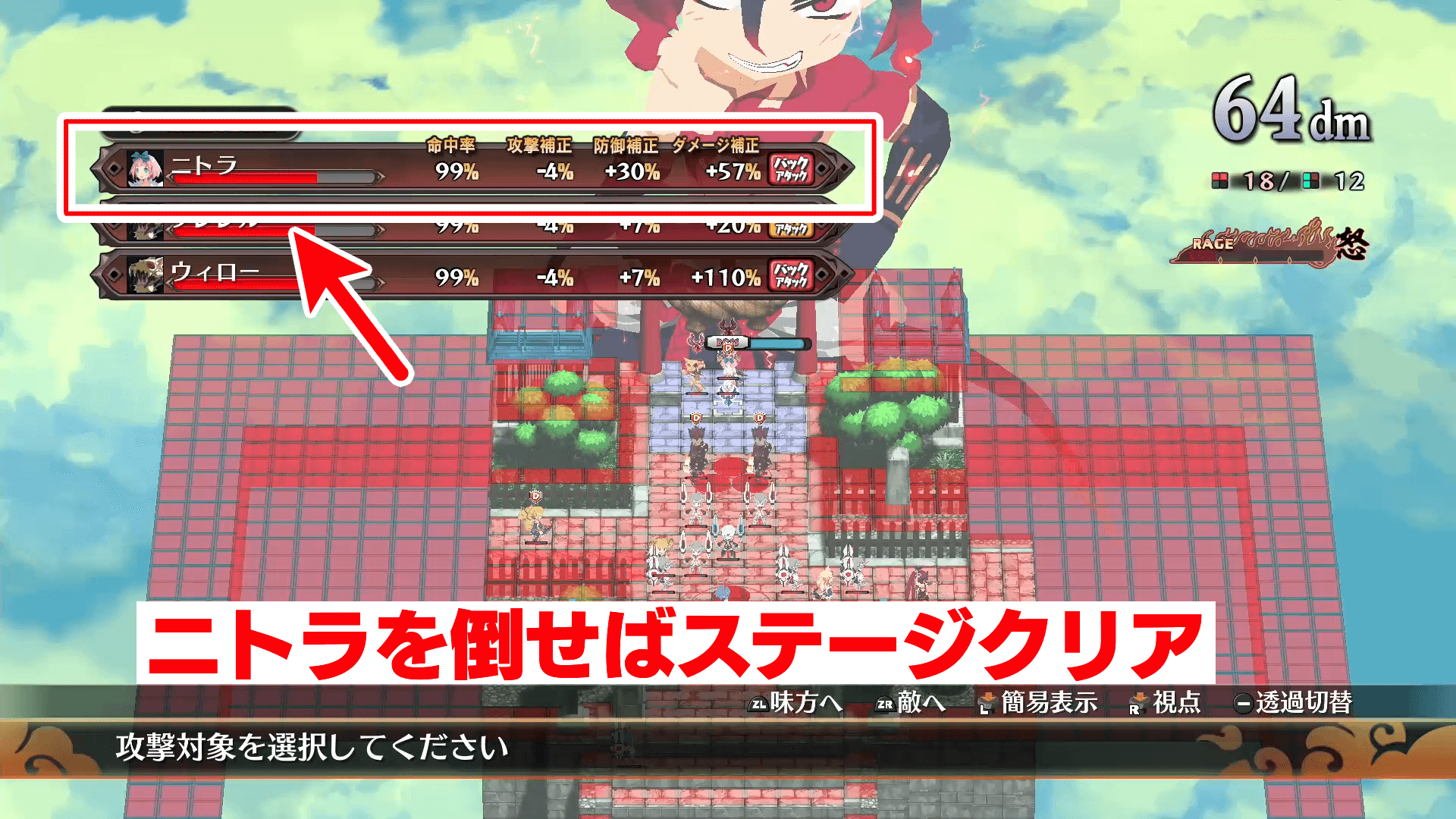 ジオシンボル周辺の敵から攻撃を受けて激弩メーターが溜まったら、弩デカ魔ックスでニトラを倒そう。弩デカ魔ックスすればステージのどこにでも攻撃できるので、ニトラの後ろに弩デカ魔ックスし、バックアタックで一撃で倒そう。