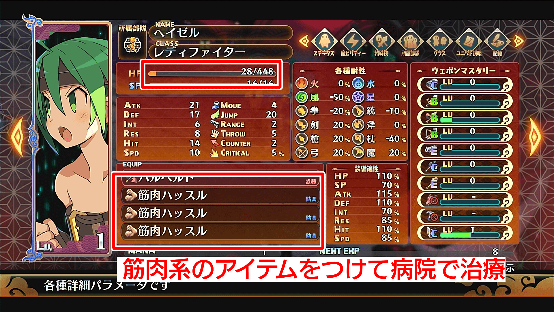 | 1 | 筋肉系の装備を付けて最大HPを増やす |