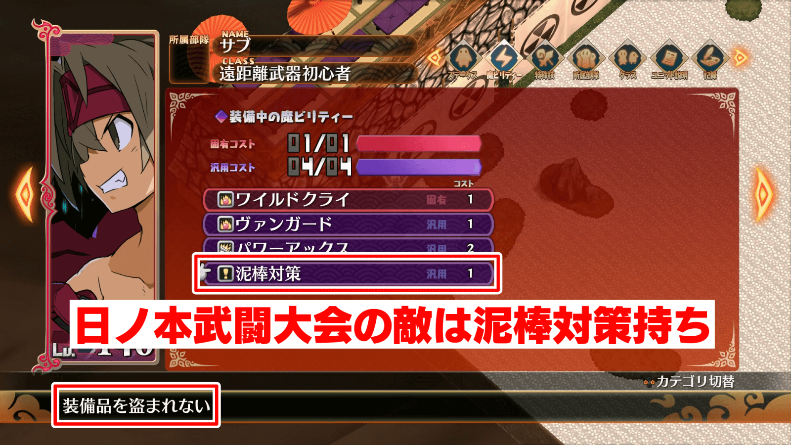 キャットスナッチやグランドセフトなど、装備を盗む系の特殊技は、日ノ本武闘大会で上げるのがおすすめ。日ノ本武闘大会に出現する敵は、魔ビリティー「泥棒対策」を持つため、1ステージでずっと盗む系特殊技レベル上げが可能だ。
