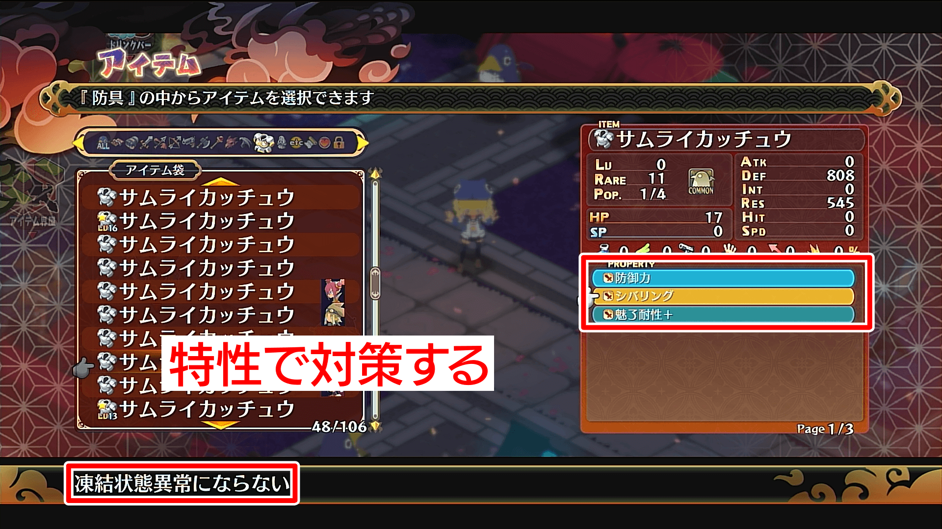 装備についている「特性(プロパティ)」で、状態異常を対策できる。各種状態異常毎に4つの特性が存在し、レア特性なら1種類の状態異常を完全にシャットアウト可能だ。