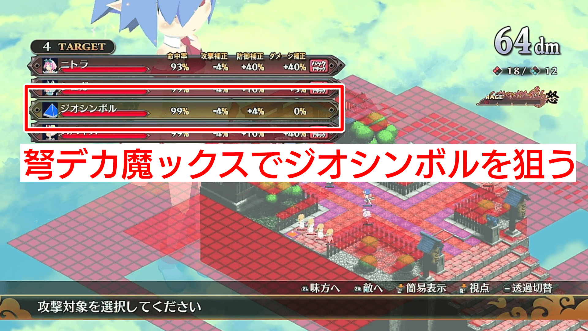 身動きが取りづらいステージなので手前の敵でゲージをためて、弩デカ魔ックスで直接ボス後方のジオシンボルを狙うのがおすすめ。「青→消滅」の順番でシンボルを破壊すれば、全てのパネルを消せる。