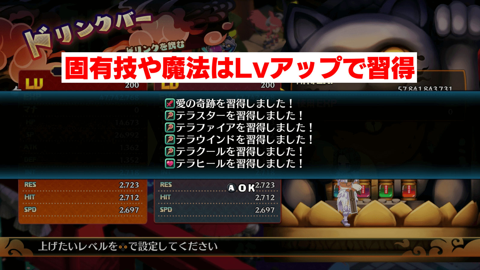 キャラ固有の特殊技や魔法は、レベルアップで習得できる。レベルアップで習得する特殊技は、固有キャラならLv80、汎用キャラならLv200時点ですべての技を習得可能だ。