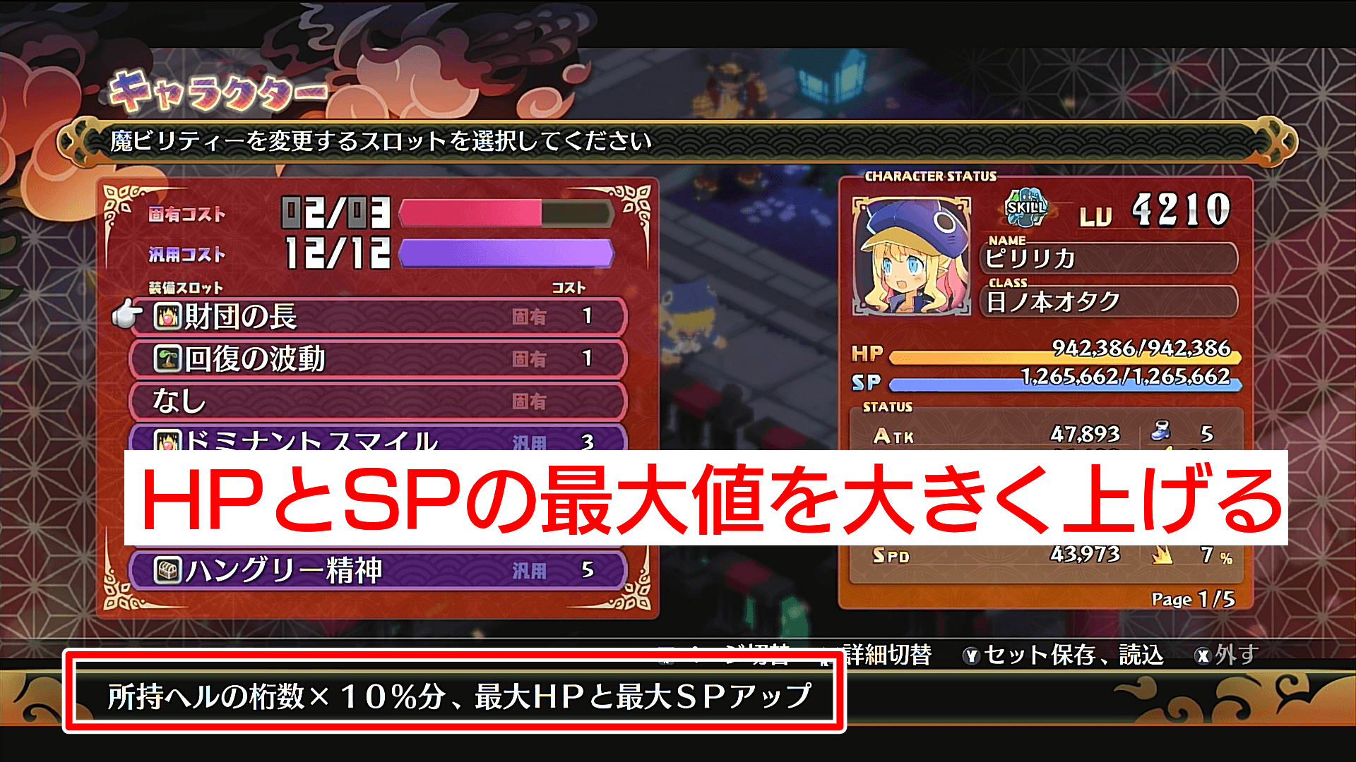 RPは減ったHPやSPを魔界病院で回復することで稼げるため、拠点内で魔ビリティー「隠密偵察」と「芸風チェンジ」を付け外ししてHPとSPを減らし、回復するのが効率的だ。両方を装備した状態で芸風チェンジ→隠密偵察の順に外せば、即座にHPとSPが1のキャラを作成できる。