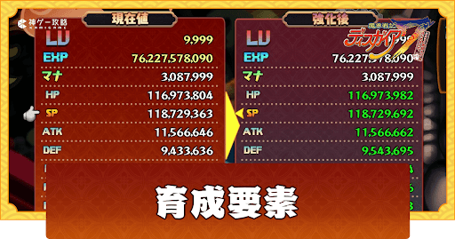 | エキス集め | ・基礎パラメータとは別枠のエキス補正を上げられる ・経験値エキス稼ぎを行えば転生数百回分の経験値を貯められる |