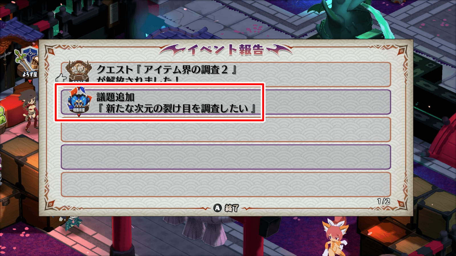 追加クエストをクリアすると、議題「次元の裂け目を調査したい」が追加され、可決すると後日談「絶勝編」が解放される。可決率は高くないものの、追想編をクリアできる強さがあれば力ずくで可決可能だ。