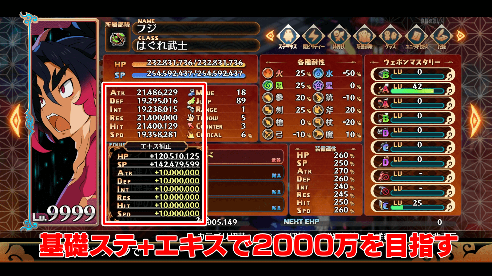 | HPとSP以外のステータス2000万を目指して育成クラス上げ+転生で基礎ステをカンストさせるエキスを集めてエキス補正をカンストさせる |