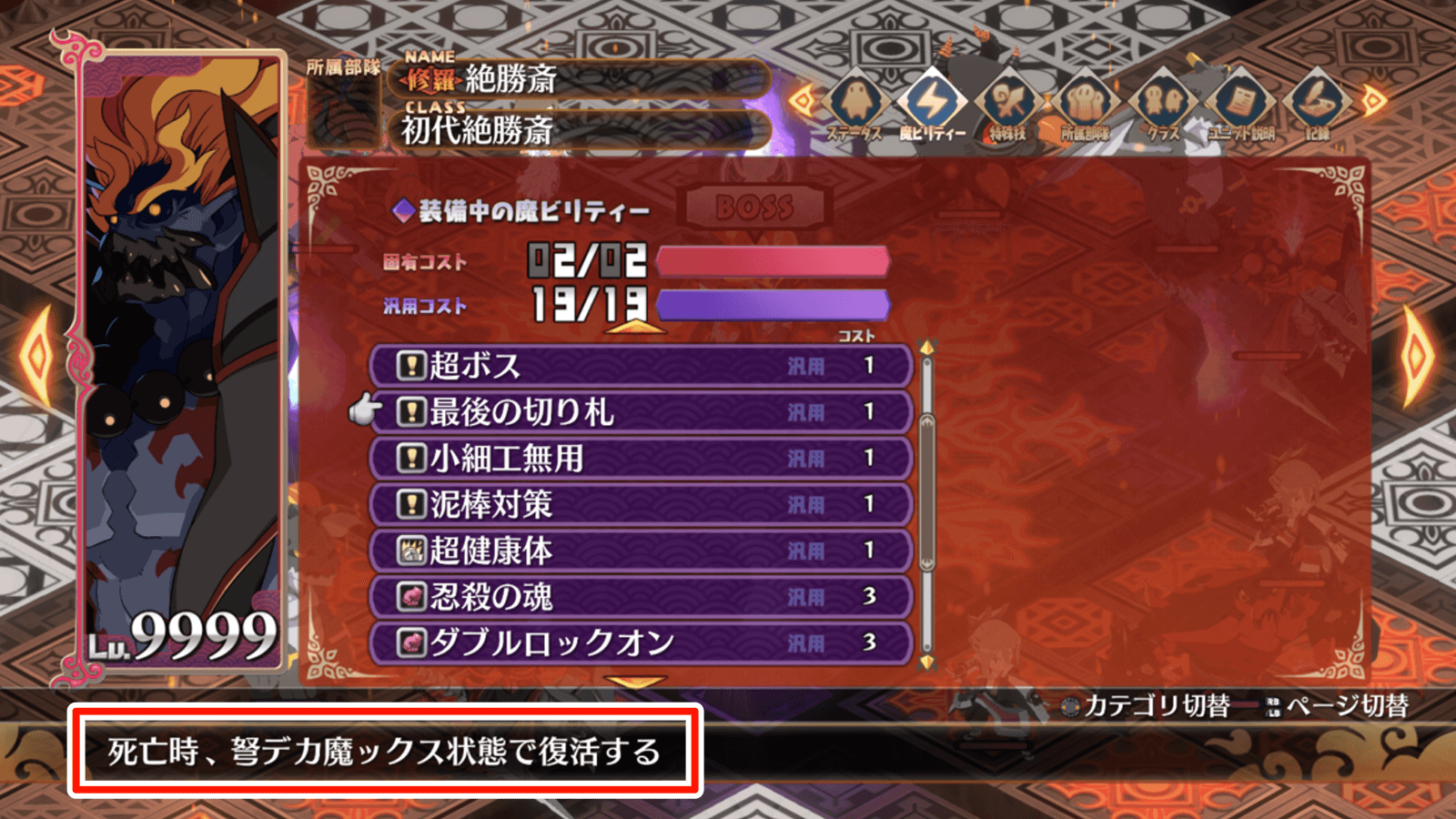 初代絶勝斎は、汎用魔ビリティー「最後の切り札」によって弩デカ魔ックス状態で復活するため、舞妓の再行動を利用して1ターンで決着を付けよう。敵にターンを回してしまうと、固有魔ビリティー「絶勝」によってマップ上の味方キャラが全滅しやすいため、クリアが難しくなる。