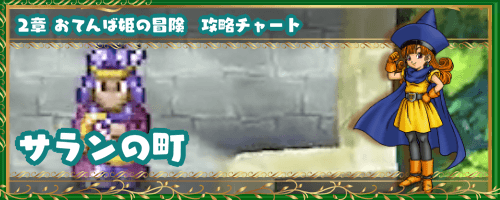 ドラクエ4(ドラゴンクエスト4)のアリーナ編で行ける拠点、「サランの町」の2章攻略チャートを掲載。探索にて拾えるもの、ショップの販売品なども紹介。2章の「サランの町」を攻略・探索する際の参考にどうぞ。