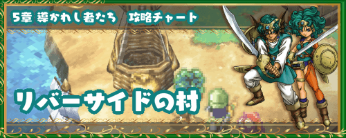 ドラクエ4(ドラゴンクエスト4)の5章で行ける拠点、「リバーサイドの村」の5章攻略チャートを掲載。探索にて拾えるもの、ショップの販売品なども紹介。5章の「リバーサイドの村」を攻略・探索する際の参考にどうぞ。