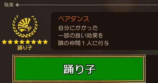 踊り子の職業とくせい「ペアダンス」は、自分に付与された一部のバフを仲間に追加付与する技です。