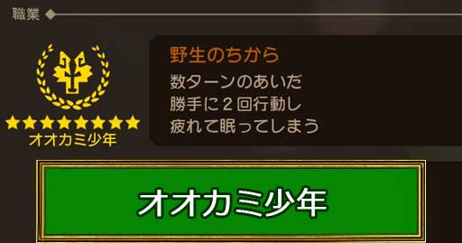 オオカミ少年の職業とくせい「野生のちから」は、数ターン操作不能になるものの2回行動してくれる、いわゆるバーサクモードです。攻撃に特化させた状態でひたすら集中攻撃させ、瞬間火力を出したい時に有効です。