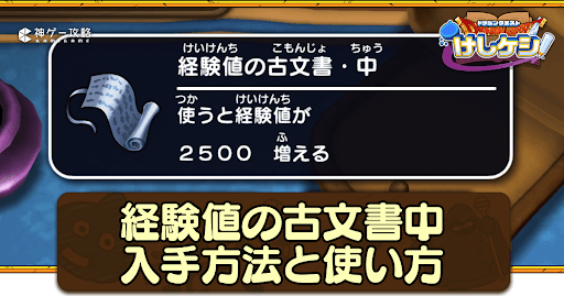 ドラ消し(ドラクエけしけし)の経験値の古文書・中について掲載!経験値の古文書・中の入手方法、使い方や効果を掲載しているため、ドラ消しを攻略する際の参考にどうぞ。