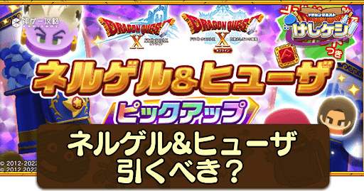 ドラ消し(ドラクエけしけし)における、ドラクエ10イベントの「ネルゲル&ヒューザピックアップガチャ」について掲載!ネルゲル&ヒューザPUガチャを引くべきかどうかや、ピックアップキャラの評価、ガチャシミュレーターを掲載しているため、ドラ消しでガチャを引く前の運試しにどうぞ。
